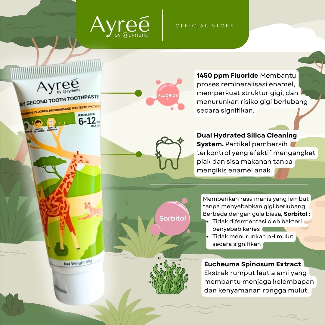 Sebagai ibu, tentu Anda ingin memberikan perlindungan terbaik untuk gigi anak — bukan sekadar wangi dan berbusa, tetapi benar-benar melindungi dari risiko gigi berlubang. Pasta gigi ini diformulasikan dengan standar perlindungan klinis Fluoride 1450 ppm (Sodium Monofluorophosphate), kadar yang direkomendasikan untuk membantu menjaga kekuatan enamel gigi tetap anak usia 6 tahun ke atas.